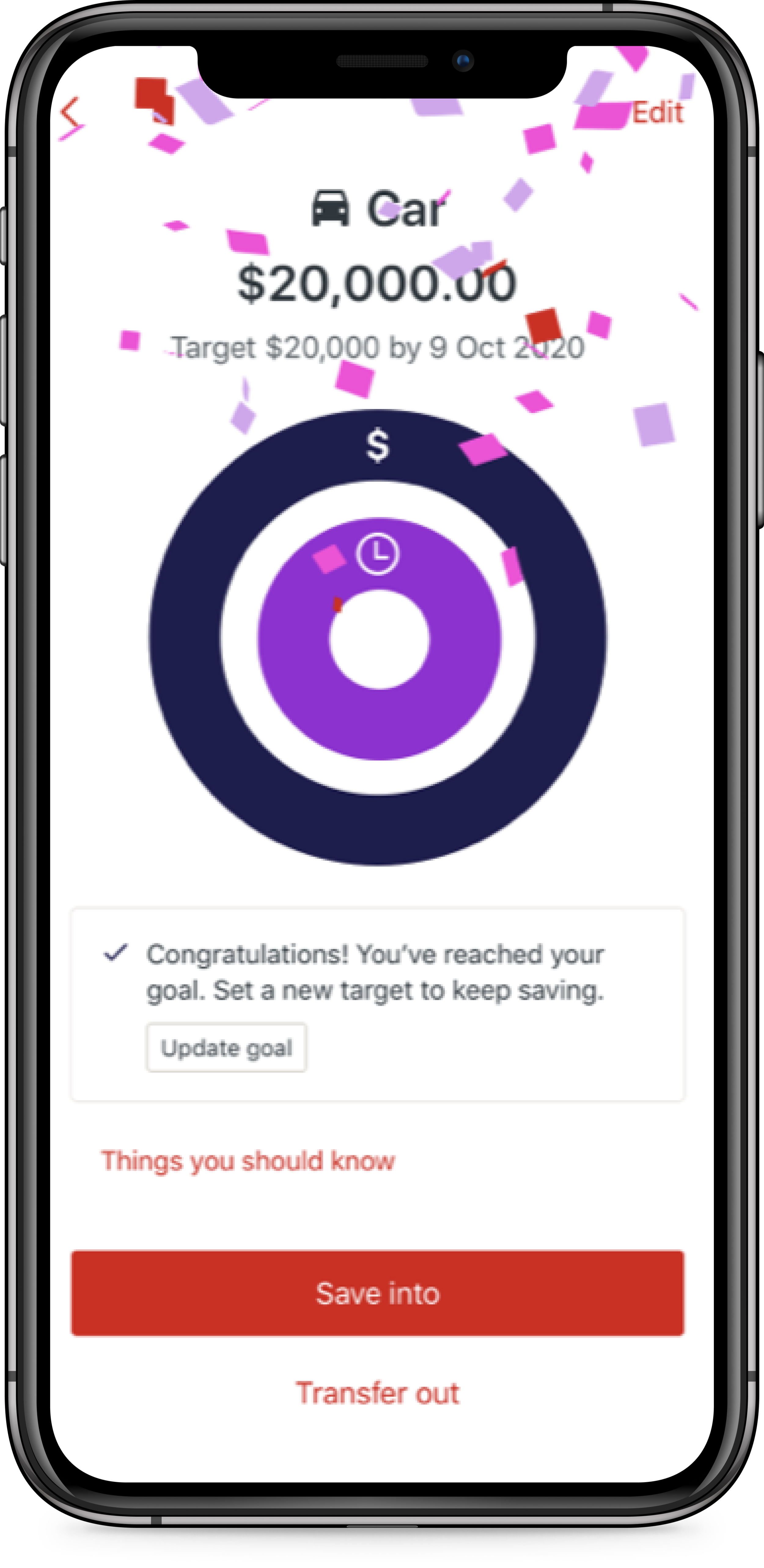 Goal visualisation and celebration is an important aspect in helping customers increase and sustain motivation to complete their savings goals.
